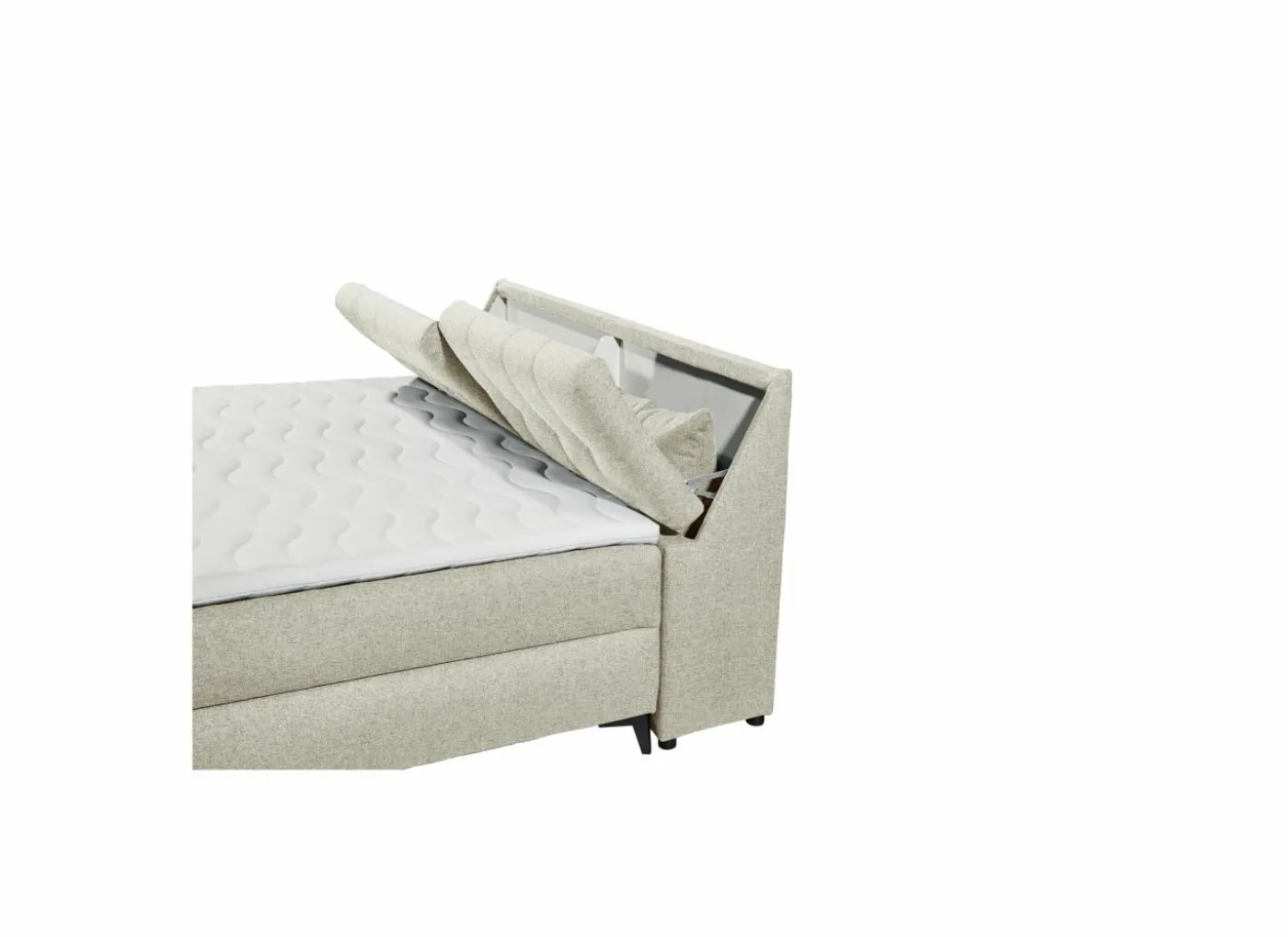 De bedbox heeft 4 opbergruimtes: 2 aan de zijkant onder de matras en 2 aan het hoofdeinde die opengeklapt kunnen worden.
