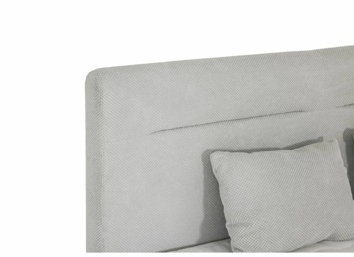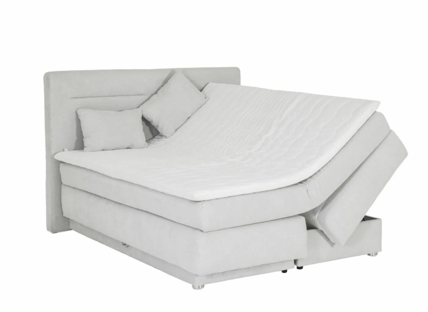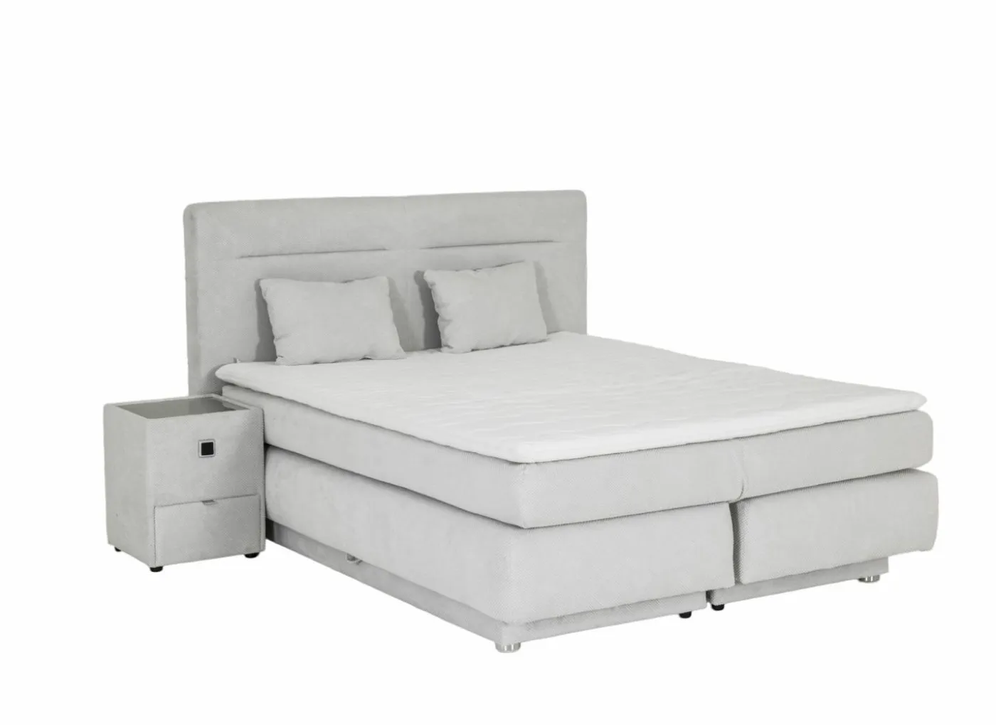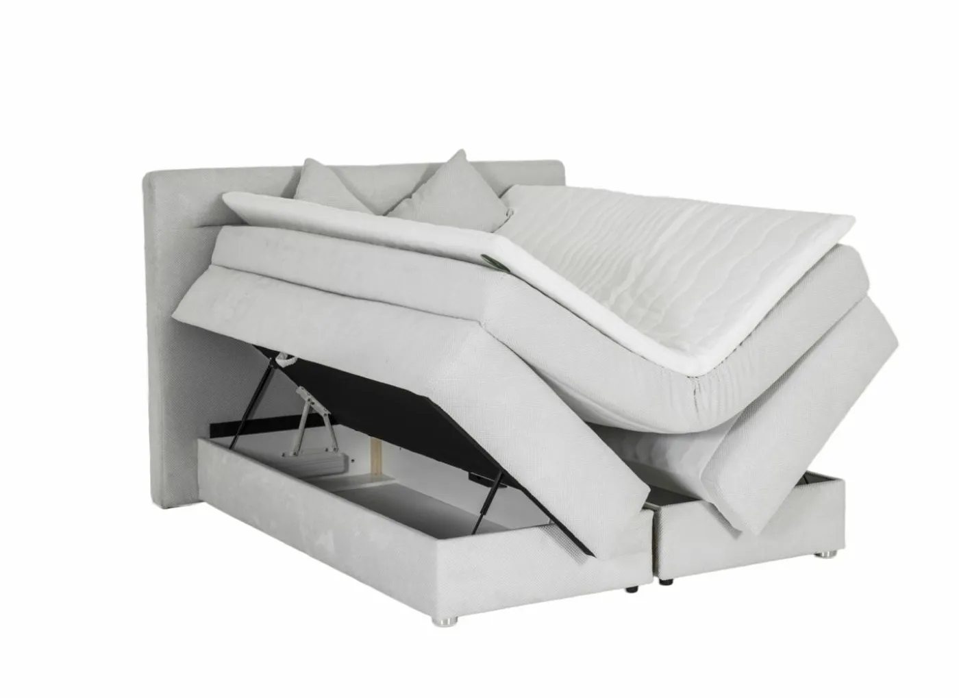 Boxspring 180×200 cm met hoofdbord (124 cm) en lighoogte van 65 cm. Voorzien van 2 opbergruimtes met gasdrukpompen en matras met dubbele bonnelkern: keuze per helft tussen zacht (H2) of stevig (H3). Inclusief 6 cm PU-schuimtopper met wasbare hoes en 2 sierkussens.