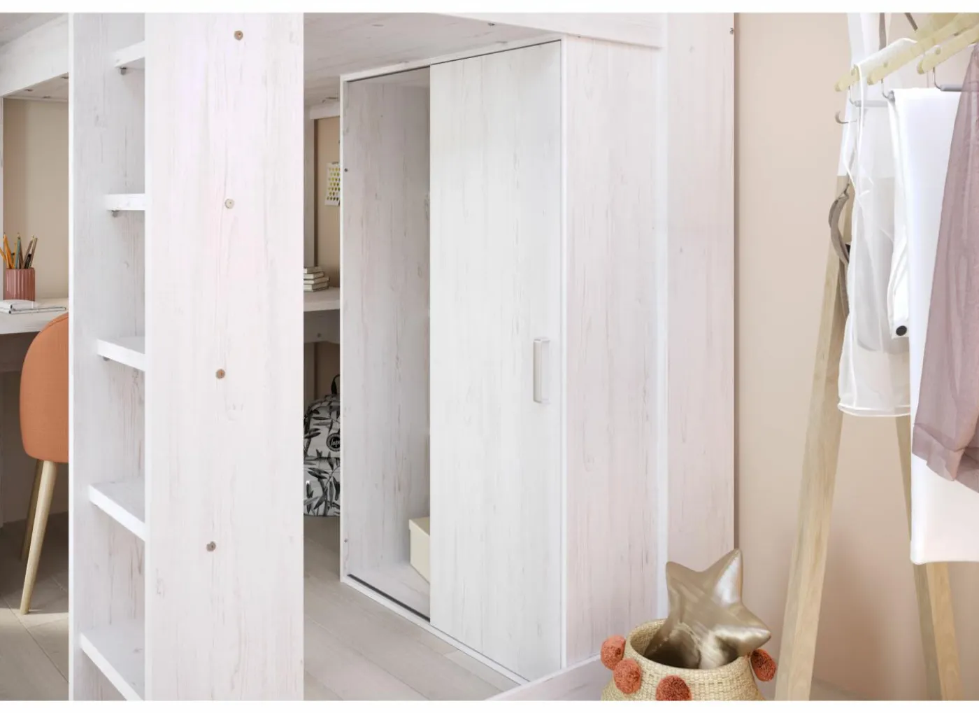 Het royale bureaublad heeft een afmeting van 133×67 cm. Achter de trap een kledingkast met 1 schuifdeur en 2 vakken, één van 130 cm hoog, 47 cm breed en 50 cm diep met een kledingroede, het andere vak heeft 3 legplanken.