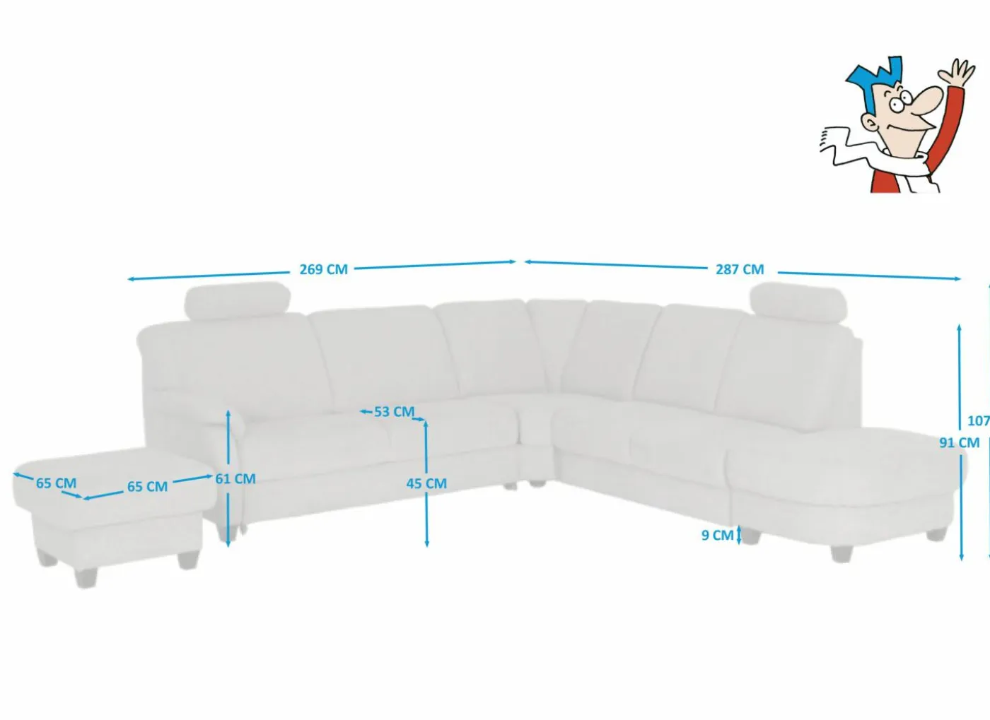 Hoeksalon Toulouse 269x287cm – stof – zilvergrijs met bedfunctie & poef & opbergruimte