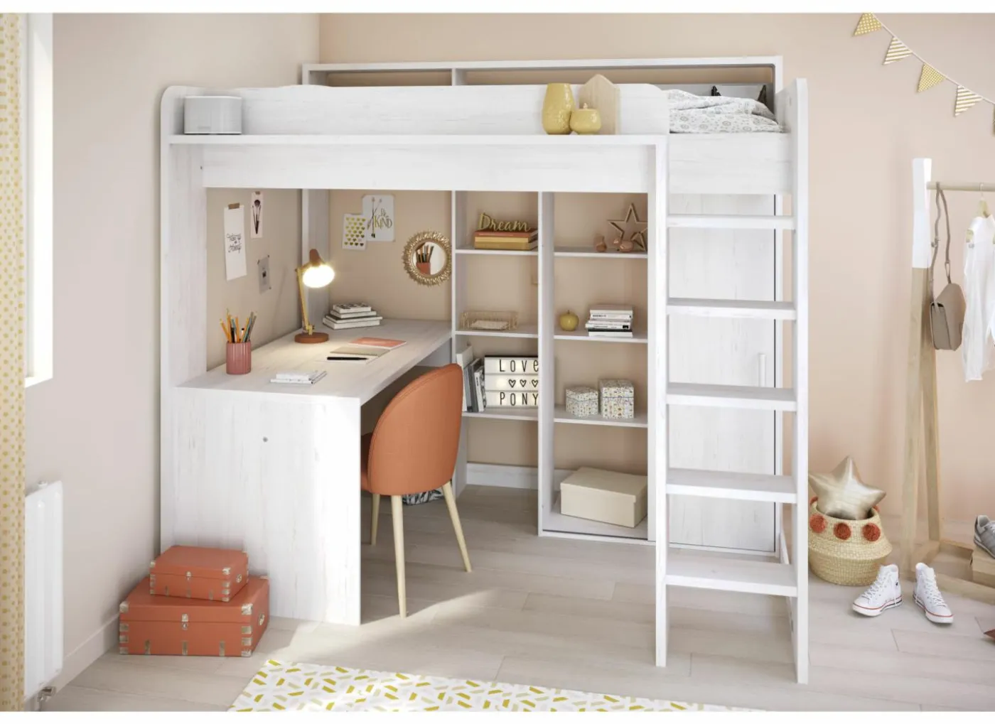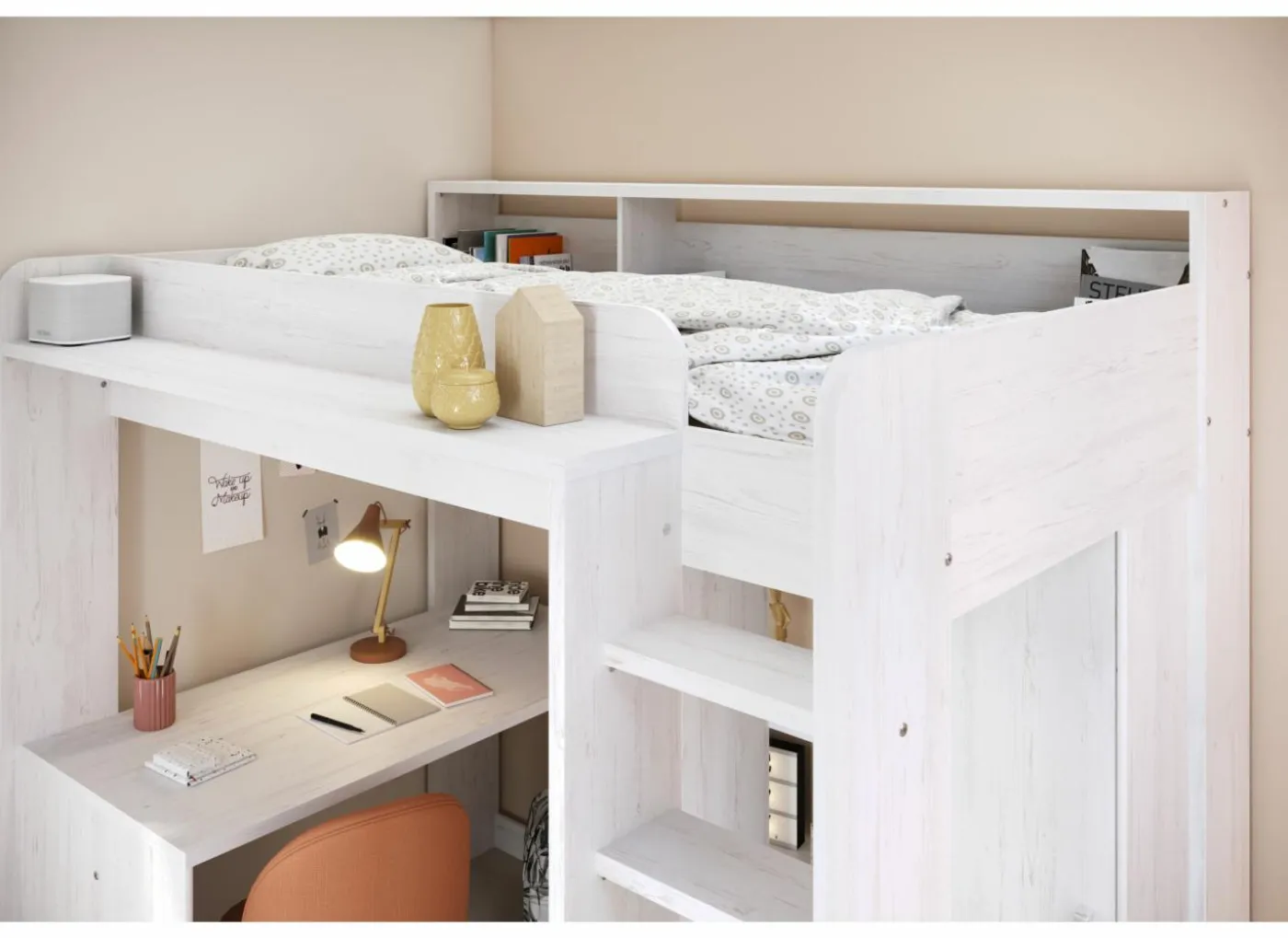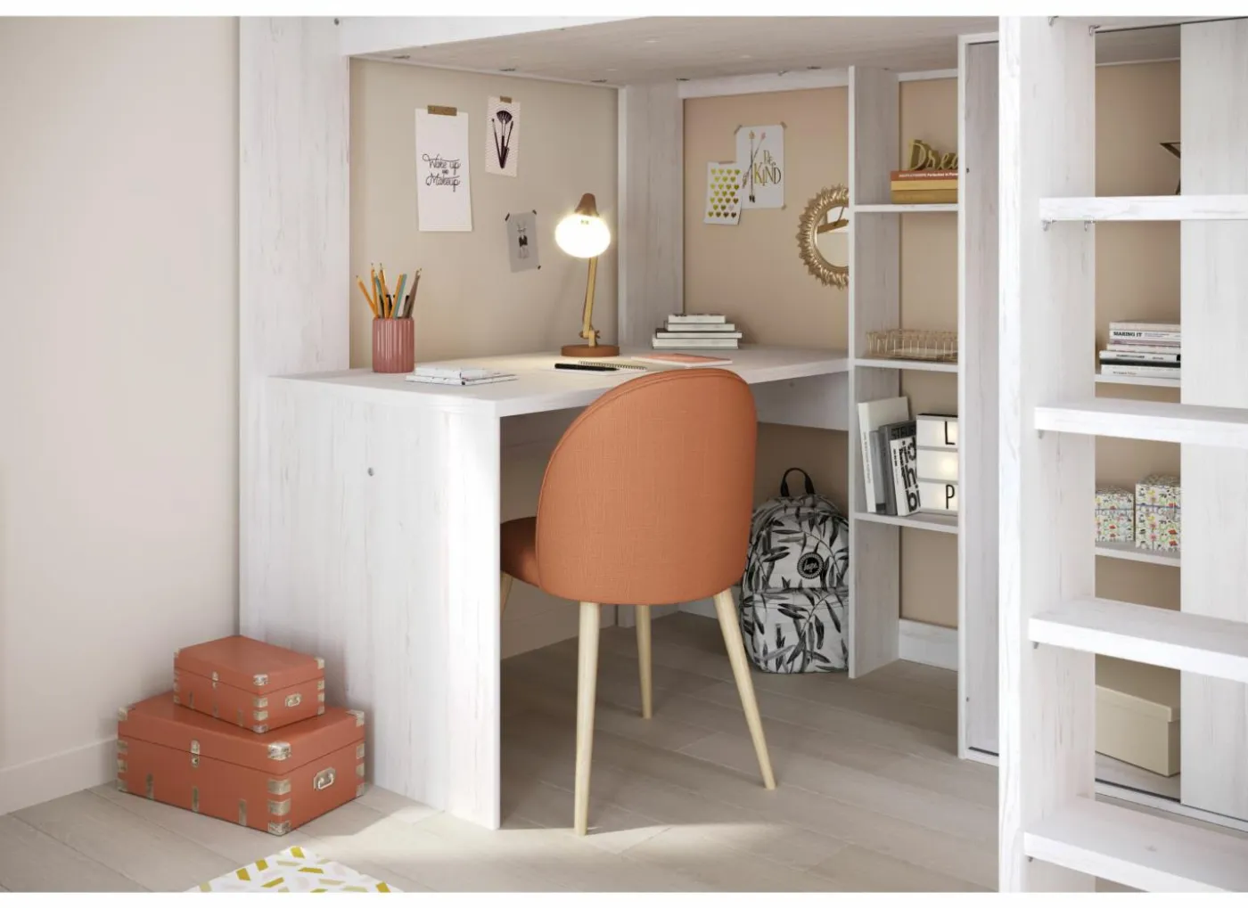 Het royale bureaublad heeft een afmeting van 133×67 cm. Achter de trap een kledingkast met 1 schuifdeur en 2 vakken, één van 130 cm hoog, 47 cm breed en 50 cm diep met een kledingroede, het andere vak heeft 3 legplanken.