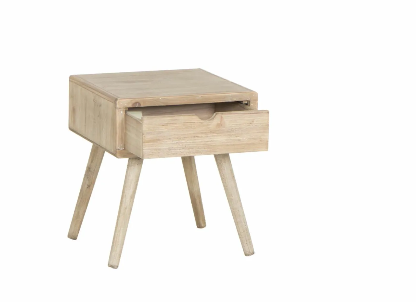 Het nachtkastje is vervaardigd uit een combinatie van massief sparrenhout, dennenfineer en MDF, waardoor het zowel stevig als duurzaam is. De natuurlijke houtkleur en het strakke ontwerp geven het meubel een moderne Scandinavische uitstraling die perfect past in een minimalistisch of eigentijds interieur.