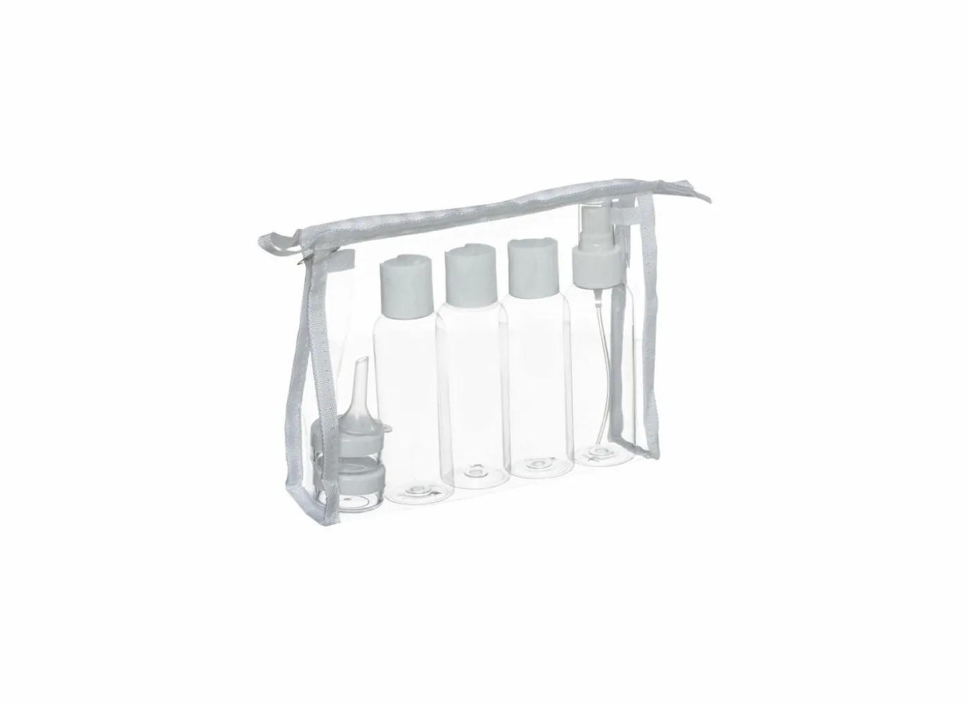 Deze reisset met flesjes bevat 3 flesjes met een press dop en 1 flesje met spuitdop die alle vier 4 cm breed en diep zijn en 10 cm hoog.